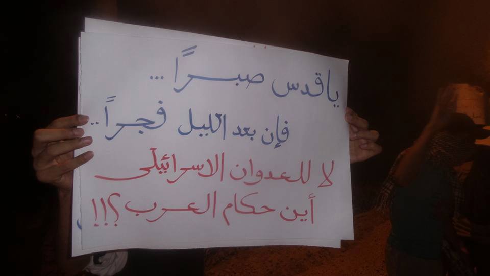 ورفع الشباب لافتات "يا قدس صبرا فإن بعد الليل فجرا"، "يا أقصانا لا تهتم راح نفديك بالروح والدم"، "قاتل السجود هو قاتل الجنود"، "الانقلاب هو الإرهاب"، مرددين هتافات تشيد بصمود المعتقلين في سجون الانقلاب، وتندد بجرائم عصابة الانقلاب بحق المصريين، مطالبين بإطلاق سراح المعتقلين والمختفين قسريا، ووقف جرائم التصفية الجسدية بحقهم.