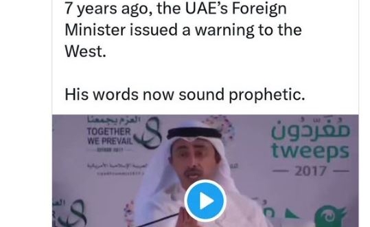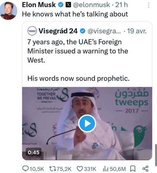 مجددا حذر وزير خارجية الامارات عبدالله بن زايد شقيق محمد رئيس الدولة من الاسلام والمسلمين وشوه صورة المسلمين في فيديو أعاد نشره وحاز على أكثر من مئة مليون مشاهدة بما وسعت له من مشاهدات منظمات متطرفة وصهيونية، إلى أن انتهى الفيديو أمام إيلون ماسك الذي قال معلقا : إنه يعرف عن ماذا يتحدث؟ ثم زكاه رجل الأعمال القبطي نجيب ساويرس الذي علق على الفيديو مادحا ما يعتبره رؤية “الوسيم” عبدالله.