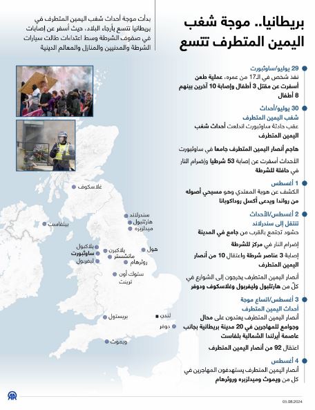 واستغل أنصار اليمين المتطرف الحادثة لإثارة أعمال العنف في ساوثبورت، حيث هاجمت عصابات اليمين المتطرف مسجدا في ساوثبورت، وأضرم المتظاهرون النار في سيارات الشرطة، واستهدفوا عناصر الشرطة وضباطها.