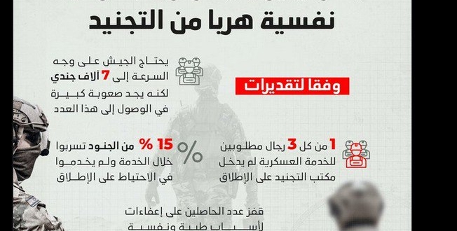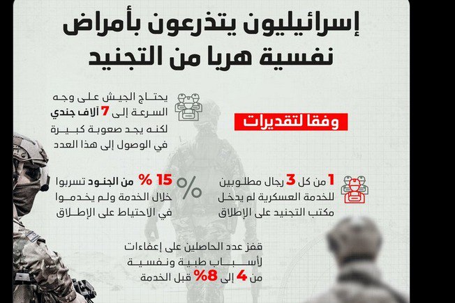 كشفت صحيفة “يديعوت أحرونوت” الصهيونية أن 1 من كل 3 رجال مطلوبين للخدمة العسكرية، هم من دخلوا مكتب التجنيد في الفترة الأخيرة، حيث إن 15%، تسربوا وتهربوا ولم يتقدموا للخدمة إطلاقا، بينما 8% تهربوا بذريعة المرض النفسي، للهروب من الخدمة العسكرية، حيث يحتاج الجيش لعدد 7 آلاف جندي.