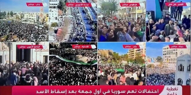 وتوافد آلاف السوريون، إلى الساحات والميادين العامة في عموم المناطق السورية للاحتفال بإسقاط نظام  الهارب بشار الأسد، وهم يحملون علم الثورة.