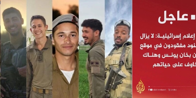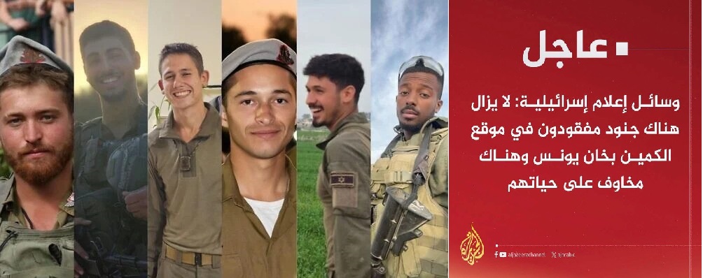 ونشرت قناة الجزيرة @AJArabic "مع الحديث عن مقتل أكثر من 3 جنود وإصابة 17 على الأقل، ما ردود الفعل في الأوساط الإسرائيلية على ذلك ووجود مفقودين في موقع كمين خان يونس؟".