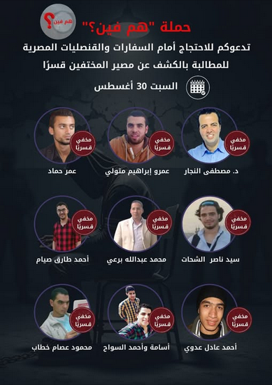 ودعت حملة (هم فين؟) لأجل المختفين قسرًا في مصر إلى تنظيم وقفات احتجاجية أمام سفارات وقنصليات مصر في الخارج، للمطالبة بكشف مصير جميع المختفين قسرًا.