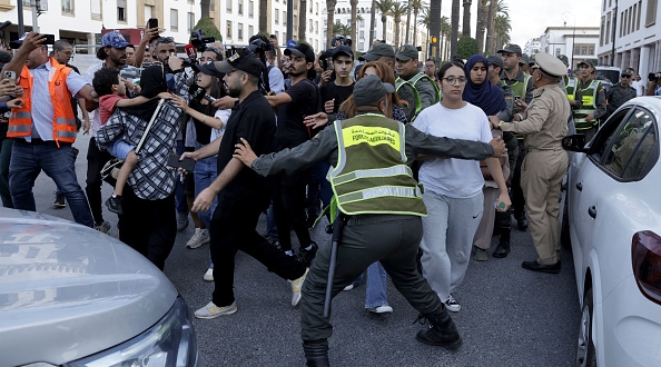 Moroccan security forces escort protesters away from the parliament building in Rabat on September 28, 2025 during a youth-led demonstration for social justice and demanding improvements to the public health and education sectors. (Photo by Abdel Majid BZIOUAT / AFP) (Photo by ABDEL MAJID BZIOUAT/AFP via Getty Images)