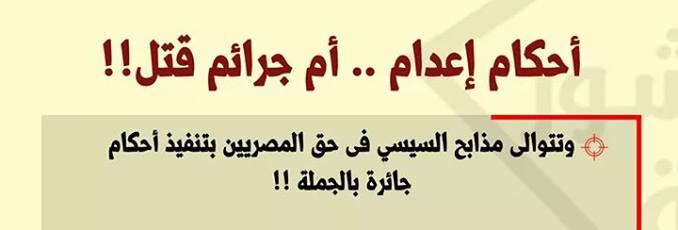 نشر نشطاء عبر الإنترنت “إنفوجراف” يكشف ما وصل إليه الوضع في دولة المشانق والحكم بالإعدام على الأبرياء. وجاء بالجرافيك أن مذابح الانقلاب العسكري بعهد السيسي تتوالى، في تنفيذ ...