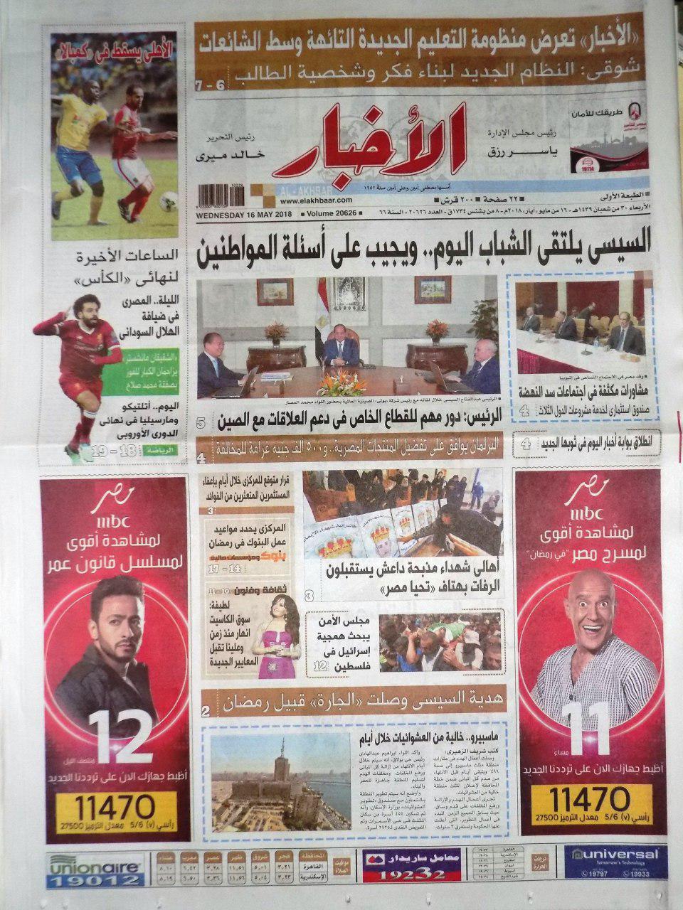 تصدرت تصريحات عبدالفتاح السيسي قائد الانقلاب مانشيتات وعناوين صحف الإثنين، وكان أبرزها تمسحه باللاعب الخلوق محمد صلاح نجم نادي ليفربول الإنجليزي الذي أصيب في نهائي دوري أبطال أوروبا ...