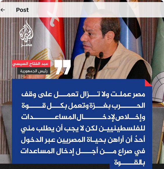 وأعلن الناشط أنس حبيب @AnasHabib98 تبرؤه الكامل من السيسي والنظام القائم، مؤكدًا أنه لا يمثله ولا يعبر عن إرادة الشعب المصري أو تاريخه أو تطلعاته، ويرفض بشدة صفقة الغاز التي يصفها بـ"صفقة العار" مع الكيان بقيمة 35 مليار دولار، معتبرًا أنها امتداد لنهج التفريط والتبعية، وخيانة لمصالح مصر وأمنها القومي، ولأهل فلسطين بعد سنوات من الإبادة والعدوان.