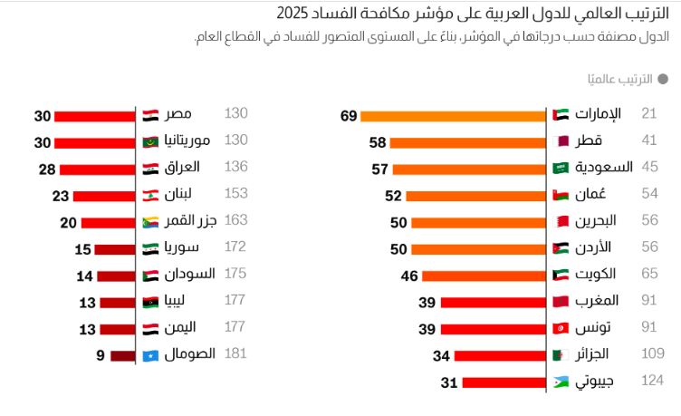 ولا يزال الفساد متجذرًا بعمق في منطقة الشرق الأوسط وشمال إفريقيا، حيث فشلت معظم الحكومات في معالجة فساد القطاع العام، وفقًا لمؤشر مدركات الفساد لعام 2025 الذي أصدرته منظمة الشفافية الدولية.