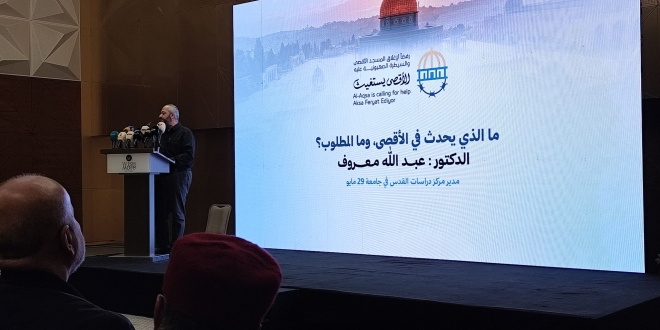 وقال الأكاديمي المقدسي د.عبدالله معروف في كلمته : "إن قام الاحتلال بفتح المسجد الأقصى في قادم الأيام بشروطه .. فإن هذا ليس إنجازا للأمة ..بل خطوة أخرى لفرض السيطرة عليه ..والهيمنة عليه بعقلية أنه صاحب الملكية ..".